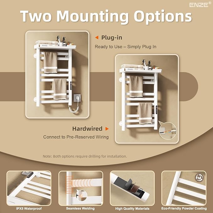 • 【Flexible Installation: Plug-in/Hardwired】 Whether you're retrofitting or renovating, this unit supports both plug-in towel warmer bars and hardwired towel warmer installations. Made of eco-coated low carbon steel, it’s a durable heated towel rack for bathroom, ideal as a wall-mounted heated towel rack or towel bar warmer for bathroom.