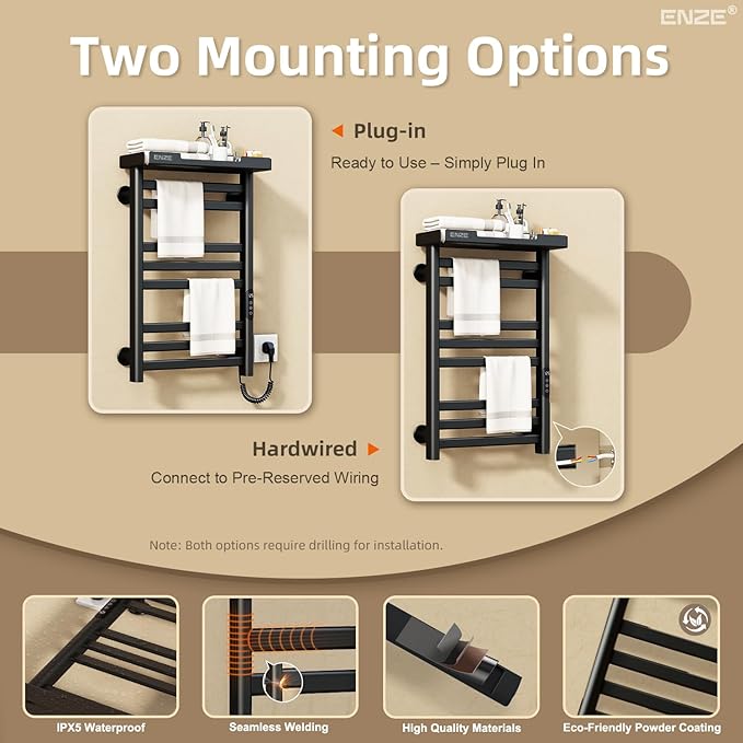 • 【Flexible Installation: Plug-in/Hardwired】 Whether you're retrofitting or renovating, this unit supports both plug-in towel warmer bars and hardwired towel warmer installations. Made of eco-coated low carbon steel, it’s a durable heated towel rack for bathroom, ideal as a wall-mounted heated towel rack or towel bar warmer for bathroom.