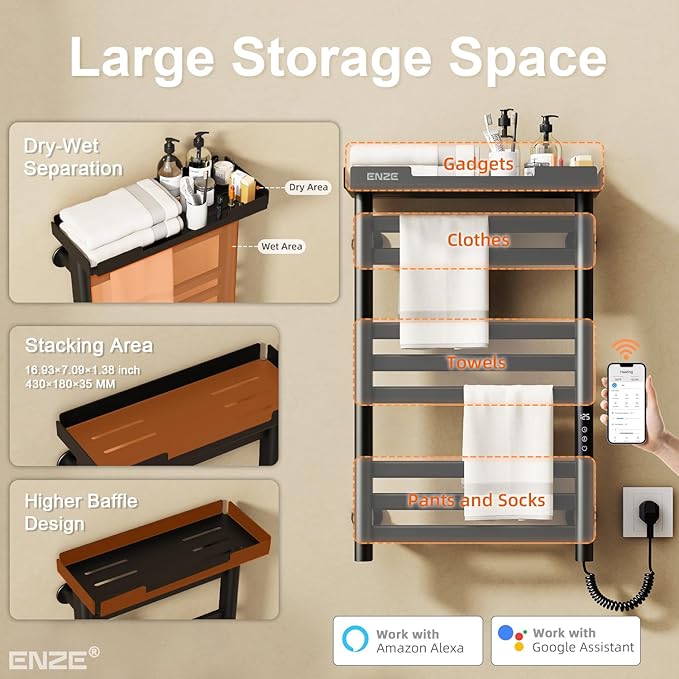 • 【Smart WiFi Towel Warmer with Voice Control】 Control your electric towel warmer anytime via the WiFi towel warmer function through Tuya app, Alexa, or Google Assistant. Experience hands-free convenience with this smart towel warmer designed for modern living.