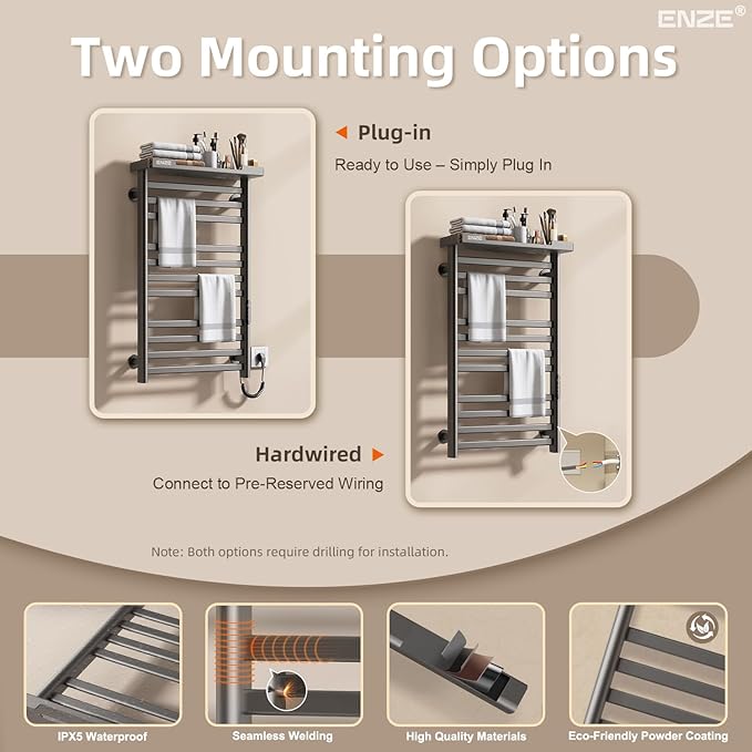 • 【Flexible Installation: Plug-in/Hardwired】 Whether you're retrofitting or renovating, this unit supports both plug-in towel warmer bars and hardwired towel warmer installations. Made of eco-coated low carbon steel, it’s a durable heated towel rack for bathroom, ideal as a wall-mounted heated towel rack or towel bar warmer for bathroom.