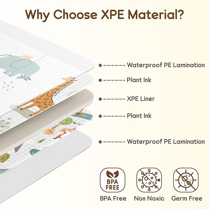 • [Safety First: Non Toxic Play Mat] - Crafted from high-density, non-toxic XPE foam, this baby crawling mat prioritizes your baby's safety. This foldable baby play mat is rigorously tested and certified free from harmful substances like BPA, lead, phthalates, and formaldehyde, ensuring a soft and protective barrier for delicate skin during playtime.