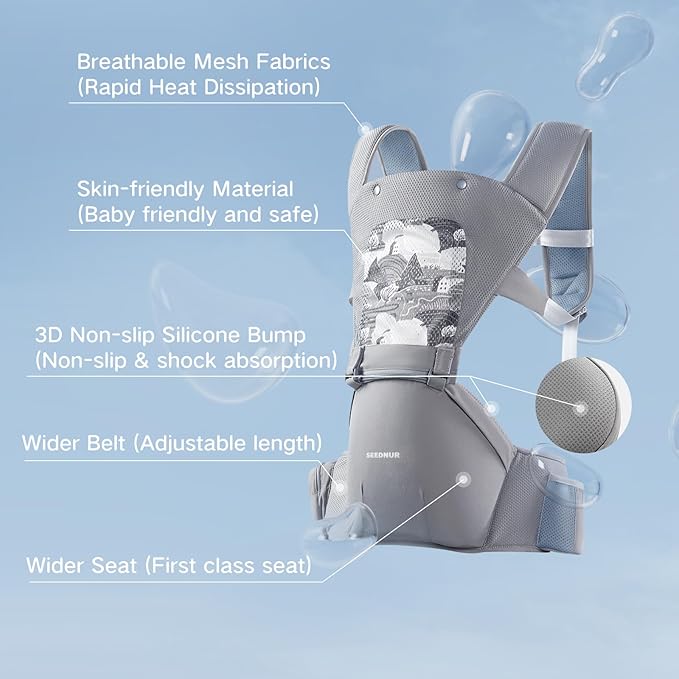 • 【6-in-1 Versatile Baby Carrier】SEEDNUR baby carrier offers 6 carrying positions—hip seat (sitting/lying) and carrier (front-in, front-out, back)—suitable from newborn to toddler. Adjustable straps and waist belt fit parents and babies of different body types.
