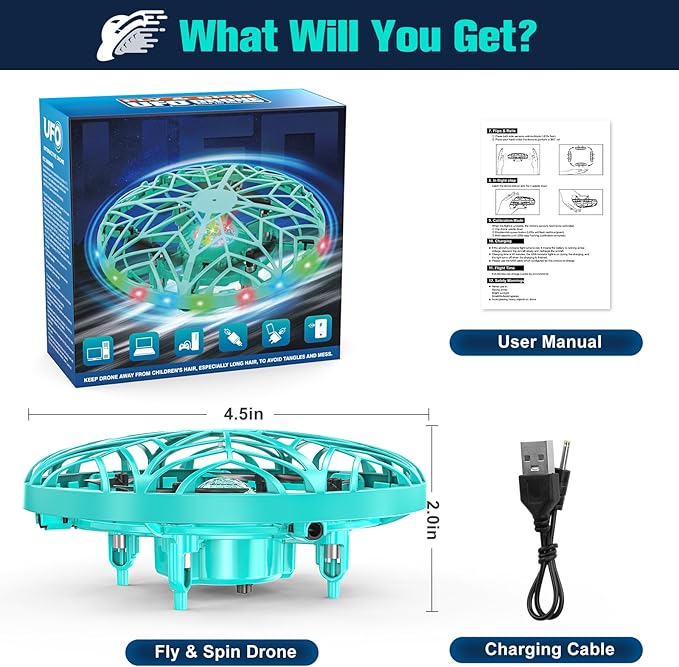 • 360° Rotating Flight Design: Fly this mini UFO drone toy with your hands! Place both hands on both sides of the drone, swipe a hand under when the lights start to blink rapidly, and watch this LED drone perform a 360° flip