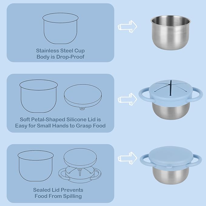 • 3-In-1 Spill-Proof Design: Our toddler snack cups no spill features a unique 3-in-1 design, specially designed for busy toddlers and even busier parents. It comes with a durable stainless steel base and a soft petal-shaped silicone lid, allowing little hands to easily grab snacks and preventing food from spilling everywhere. The included leak-proof travel lid locks in freshness and prevents leaksโ€”no more worrying about messes on the couch, in the car, or in your bag!