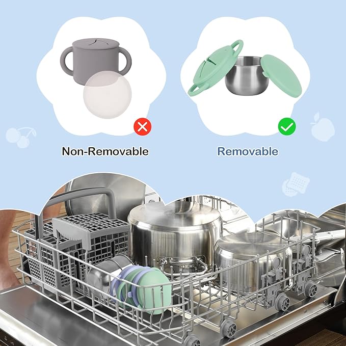 • Easy to Clean: Say goodbye to sticky residue and odors! Our baby snack cups feature a unique 3-in-1 detachable design that can be opened with a simple twist, making deep cleaning easy and simple. It is stain-resistant and dishwasher-safe, or can be quickly wiped clean. This makes cleaning a breeze for busy parents, allowing children to be ready to enjoy any snack time adventure.