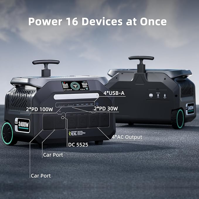 • 【Power for Home and Outdoor Adventures】With 2048Wh capacity and 2400W rated output, this station can power up to 99% of your devices through multiple ports: 4 AC outlets, 4 USB-A ports (30W), 2 fast-charging USB-C ports (100W), 2 standard USB-C ports (30W), 2 DC outlets, and 1 car cigarette lighter port. It’s a reliable solution for home use, outdoor activities, RV life, DIY projects, or job sites—compatible with phones, laptops, tools, kitchen appliances, car gear, and more.