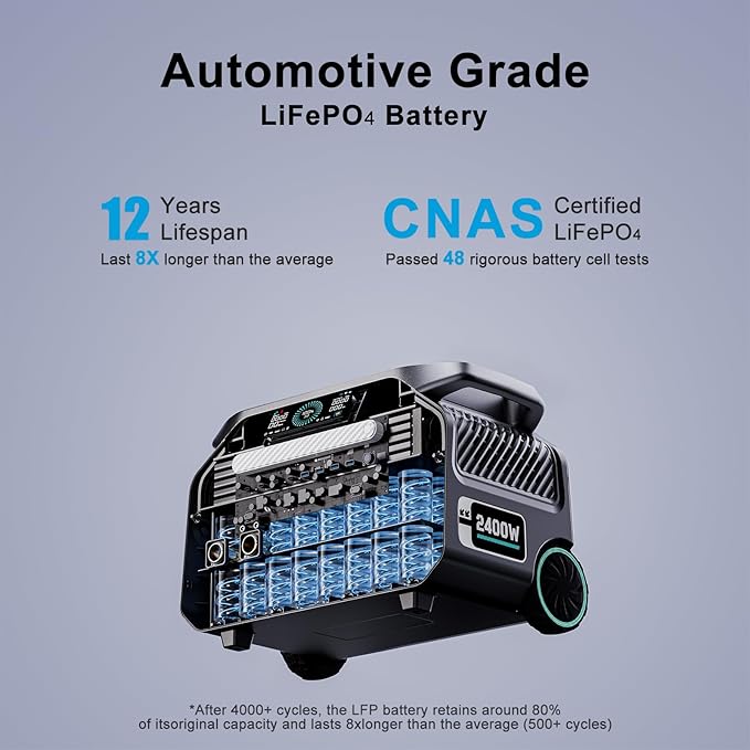 • 【Premium LiFePO4 Battery for Long-Term Use】Equipped with high-quality LiFePO4 (lithium iron phosphate) batteries, the power station offers over 4,000 charge-discharge cycles and a lifespan of up to 15 years. Compared to traditional batteries, it delivers up to 7 times longer life and greater cost efficiency. Built-in Battery Management System (BMS) and Micro Control Unit (MCU) help monitor voltage and temperature to ensure stable, safe operation.