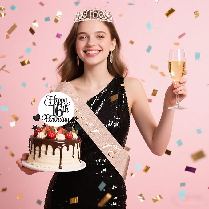 • 16th Rhinestone Crown & Sparkly Sash: The birthday sash, made of soft fabric via hot-press stamping glitter technique, features superior quality with non-shedding glitter and rose gold Sweet 16 birthday letters. The crown, crafted from sturdy hard alloy with dazzling rhinestones, is meticulously designed for 16th birthday parties.