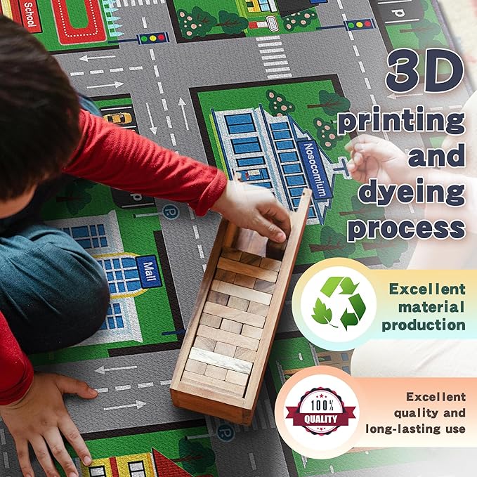 • Detailed & Recognizable Scenes:Our carpet includes facilities such as a bakery, bookstore, department store, pharmacy, supermarket, hair salon, and school, allowing children to enjoy having a city of their own that they can control.