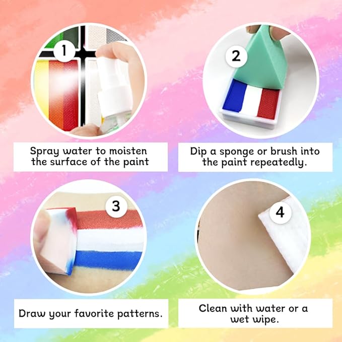 • Easy to Use & Clean – A favorite among beginners and pros! The water-based paint activates with a little water—simply dampen the brush/sponge, swipe, and apply smoothly. Dries quickly without smudging, and washes off effortlessly with soap and water or wipes. No mess, just fun—why it’s loved for quick party setups!