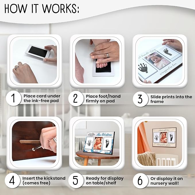 • NO HASSLE, NO MESS BABY KEEPSAKE - With lovely designs you can choose from, built-in acrylic cards to insert the prints to, a printed photo of your baby, no-mess inkpads for baby hand and footprints, this is the easiest way to capture your babyโ€™s adorable prints forever. It comes with 4 print cards and 4 safe, no-mess ink pads, so you can try to get the perfect print more than once!
