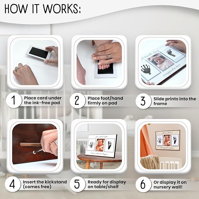 • NO HASSLE, NO MESS BABY KEEPSAKE - With lovely designs you can choose from, built-in acrylic cards to insert the prints to, a printed photo of your baby, no-mess inkpads for baby hand and footprints, this is the easiest way to capture your babyโ€™s adorable prints forever. It comes with 4 print cards and 4 safe, no-mess ink pads, so you can try to get the perfect print more than once!