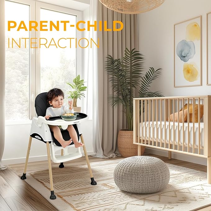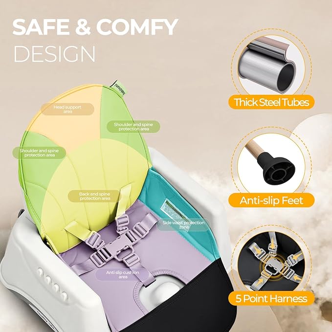 • Multiple Safety Protections: Sturdy steel tubes and a golden triangle design prevent tipping. The adjustable 5 point harness high chair ensures your babyโ€™s safety, making this highchair a top choice for parents.